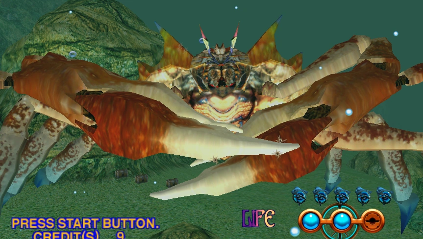 After one-third of its health is gone, phase 2 will begin and Karkinos will pin the player character to the sea floor and try to trample them with three of its legs. The player must fire at the incoming legs as they get near the camera. It is recommended to shoot the legs in a pattern (i.e. left-middle-right) to avoid being overwhelmed by the attack.